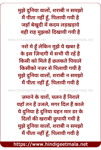 Lyrics of Mujhe Duniyawalo Sharabi Na Samjho - मुझे दुनिया वालों, शराबी न समझो