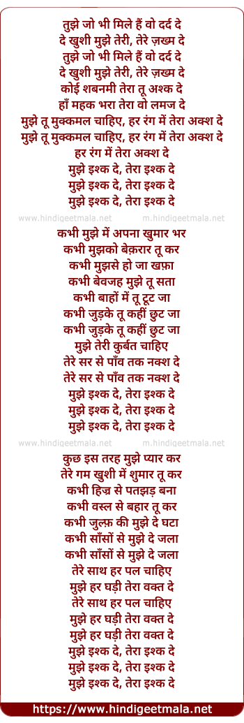 Lyrics of Mujhe Ishq De, Tera Ishq De - तुझे जो भी मिले हैं वो दर्द दे