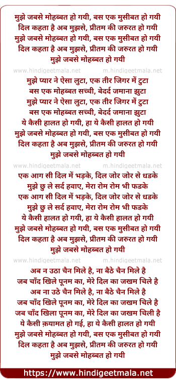 Lyrics of Mujhe Jabse Mohabat Ho Gayi Bas Ek Musibat Ho Gyi - मुझे जबसे मोहब्बत हो गयी बस एक मुसीबत हो गयी