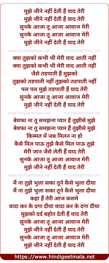 Lyrics of Mujhe Jine Nahi Deti Hai Yaad Teri - मुझे जीने नहीं देती हैं याद तेरी