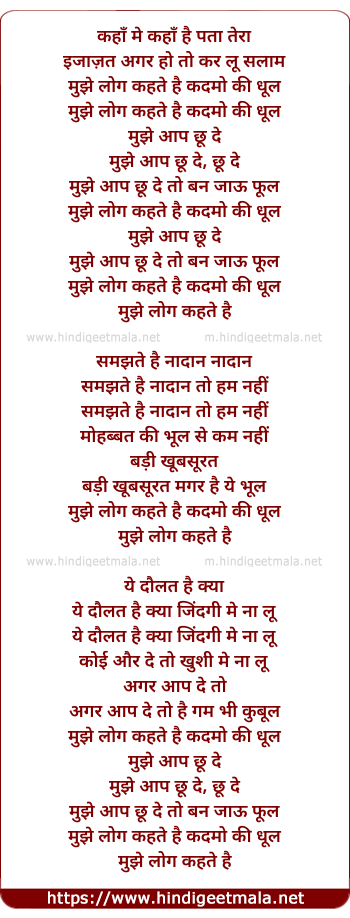 Lyrics of Mujhe Log Kehte Hai Kadmo Ki Dhool - मुझे लोग कहते है कदमो की धूल