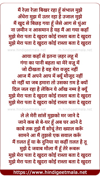 Lyrics of Mujhe Mera Pata De Khudara - मुझे मेरा पता दे खुदरा