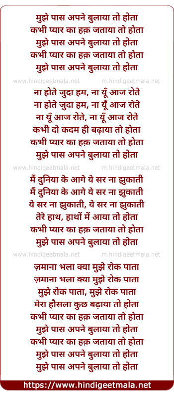 Lyrics of Mujhe Paas Apne Bulaya To Hota - मुझे पास अपने बुलाया तो होता