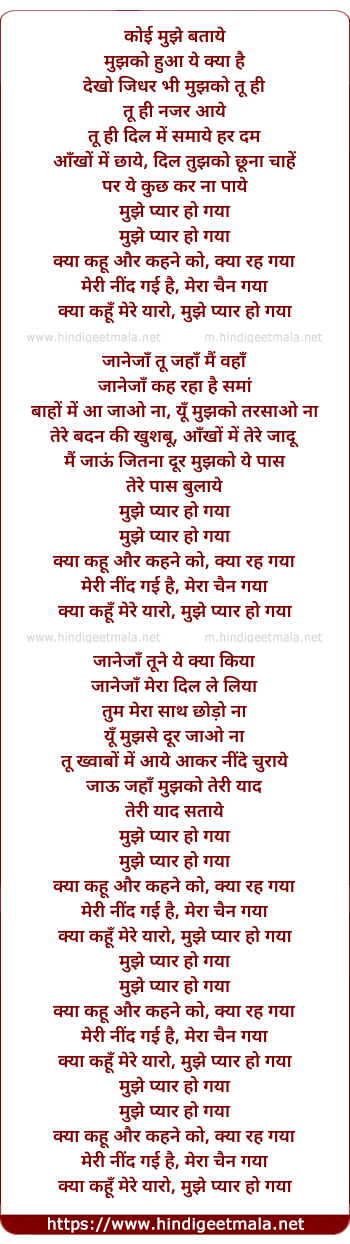 Lyrics of Mujhe Pyar Ho Gaya - कोई मुझे बताये