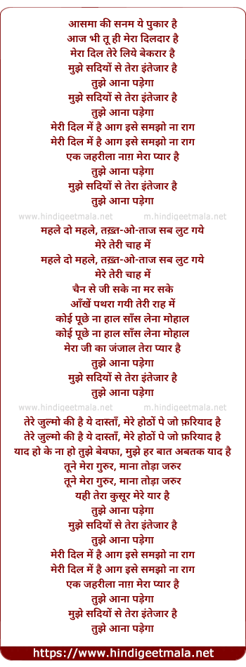 Lyrics of Mujhe Sadiyo Se Tera Intejaar Hai - मुझे सदियों से तेरा इंतजार है