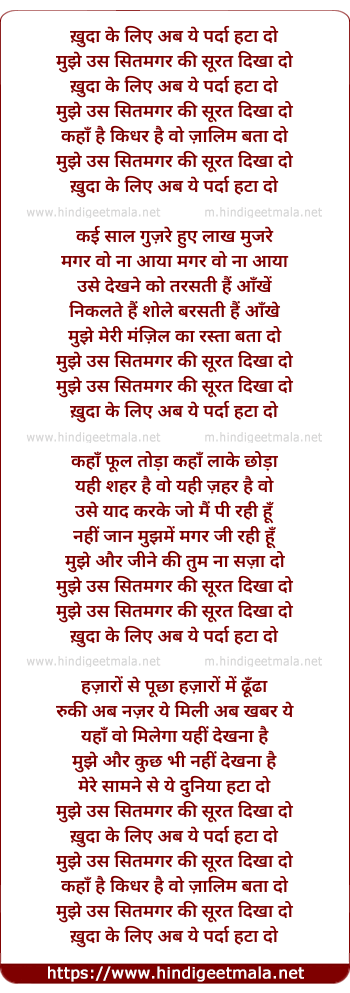 Lyrics of Mujhe Uss Sitamagar Kee Surat Dikha Do - ख़ुदा के लिए अब ये पर्दा हटा दो