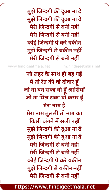Lyrics of Mujhe Zindagi Ki Dua Na De (Female) - मुझे जिन्दगी की दुआ ना दे
