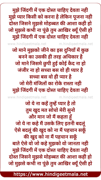 Lyrics of Mujhe Zindagi Me Ek Dost Chahiye - मुझे जिंदगी में एक दोस्त चाहिए देवता नही