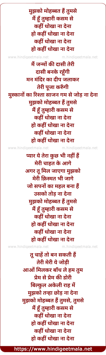Lyrics of Mujhko Mohabbat Hai Tumse - मुझको मोहब्बत हैं तुमसे