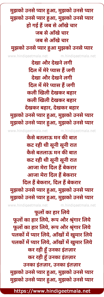 Lyrics of Mujhko Unse Pyar Hua - मुझको उनसे प्यार हुआ,
