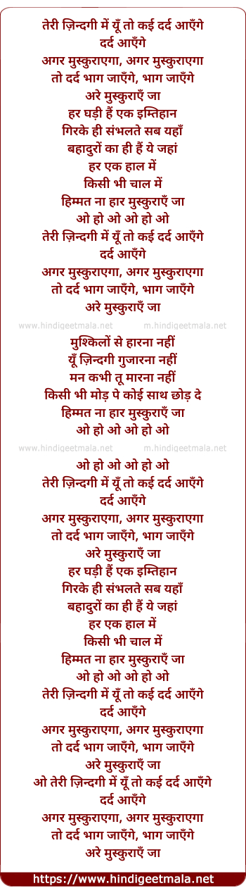 Lyrics of Muskuraye Jaa - तेरी ज़िन्दगी में यूँ तो कई दर्द आएँगे