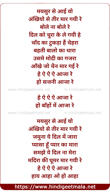 Lyrics of Mysore Se Aayee - मयसुर से आई वो