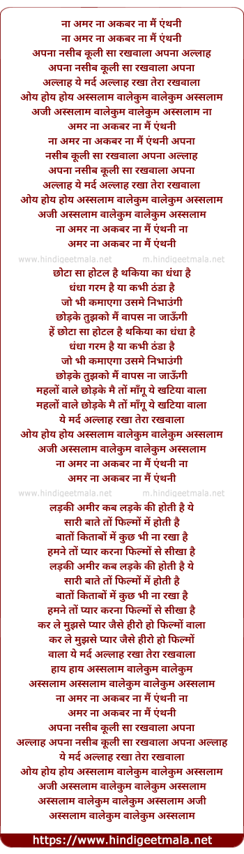 Lyrics of Na Amar Na Akbar Na Mai Anthony - ना अमर ना अकबर ना मैं एंथनी
