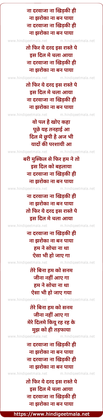 Lyrics of Na Darwaja Na Khidki - ना दरवाजा ना खिड़की