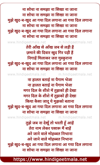 Lyrics of Na Socha Na Samjha Na Sikha Na Jaana Mujhe Khud Ba Khud - ना सोचा ना समझा ना सिखा ना जाना मुझे खुद-ब-खुद