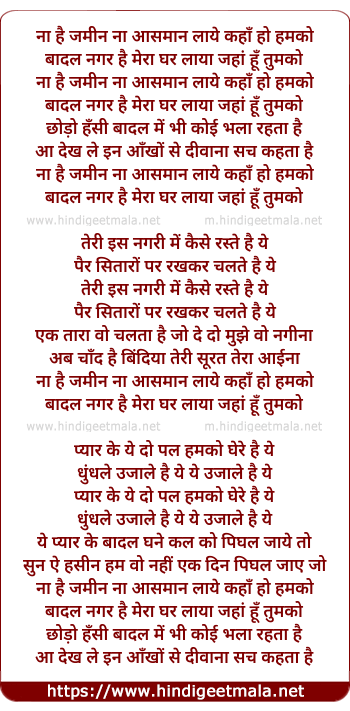 Lyrics of Naa Hai Jamin Naa Aasman - ना है जमीन ना आसमान