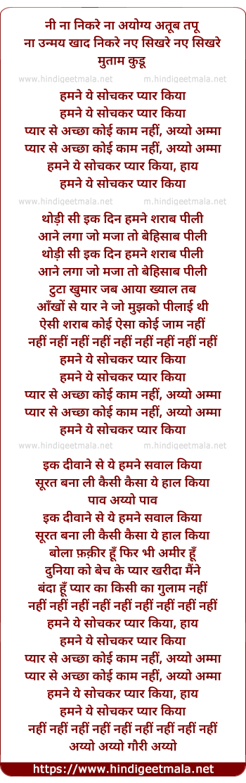 Lyrics of Na Humne Ye Soch Ke Pyar Kiya Ki Pyar Se Achcha Koi Kaam Nahi - ना हमने ये सोच के प्यार किया कि प्यार से अच्छा कोई काम नहीं