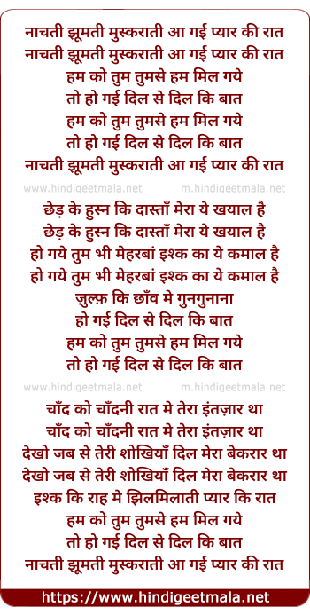 Lyrics of Nachti Jhoomti Muskurati Aa Gayi Pyar Ki Raat - नाचती झूमती मुस्कराती आ गई प्यार की रात