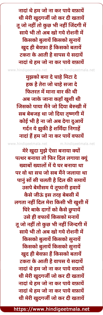 Lyrics of Nadaan The (Revise) - नादां थे हम जो ना कर पाये वफ़ायें
