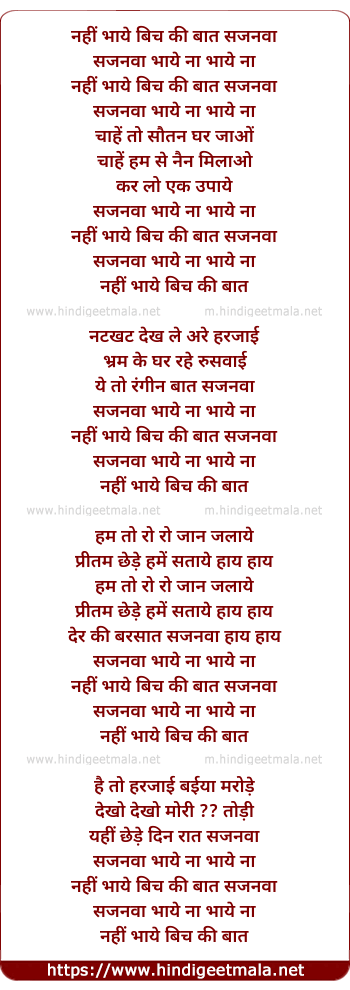 Lyrics of Nahi Bhaye Beech Ki Baat - नहीं भाये बिच की बात सजनवा