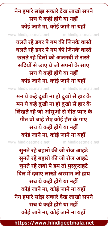 Lyrics of Nain Hamaare Saanjh Sakaare, Dekhane Laakhon Sapane - नैन हमारे सांझ सकारे देख लाखो सपने