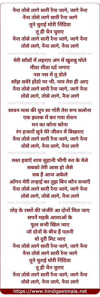 Lyrics of Naina Tose Laage - नैना तोसे लागे सारी रैना जागे, जागे नैना