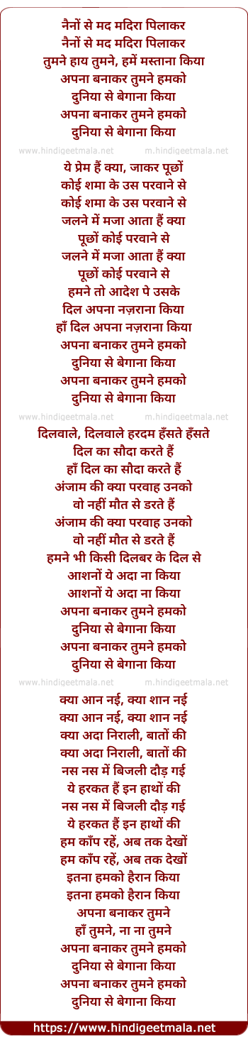 Lyrics of Naino Se Mad Madira Pilakar - नैनों से मद मदिरा पिलाकर