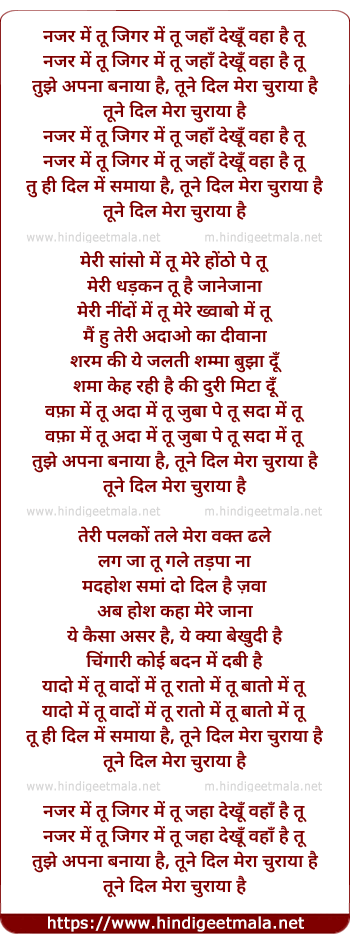 Lyrics of Nazar Mein Tu, Jigar Mein Tu - नजर में तू जिगर में तू