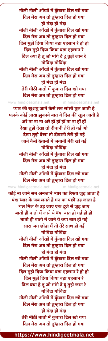 Lyrics of Neeli Neeli Ankhon Mein - नीली नीली आँखों में