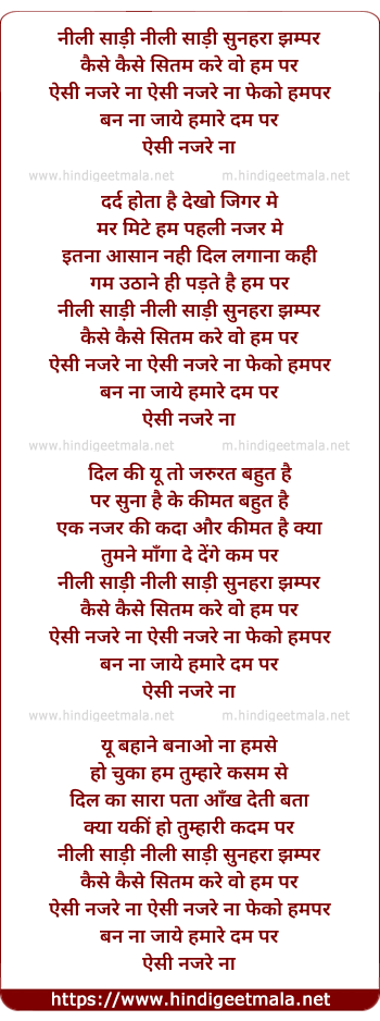 Lyrics of Neeli Saadi Sunehra Jhampar, Kaise Kaise Sitam Kare Wo Hum Par - नीली साड़ी सुनहरा झम्पर, कैसे कैसे सितम करे वो हम पर