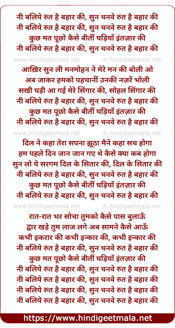 Lyrics of Ni Baliye Rut Hai Bahaar Ki Sun Chanve Rut Hai Bahar Ki - नी बलिये रुत है बहार की सुन चनवे रुत है बहार की