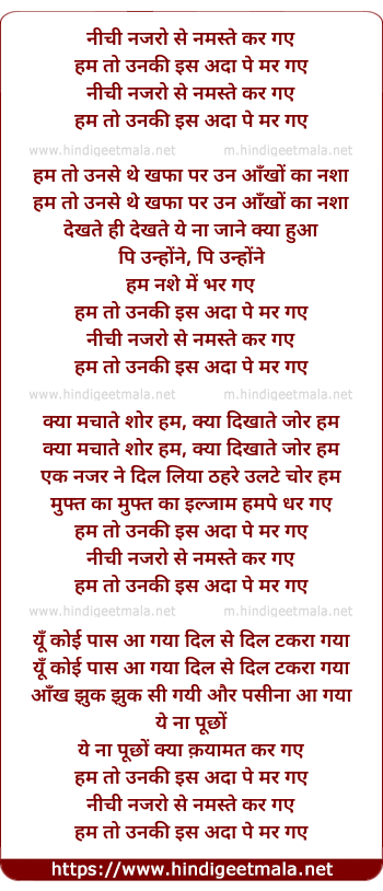 Lyrics of Nichi Nazron Se Namaste Kar Gaye Hum Toh Unki Iss Adda Pe Mar Gaye - नीची नजरो से नमस्ते कर गये हम तो उनकी इस अदा पे मर गये