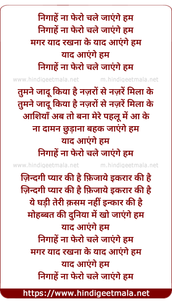 Lyrics of Nigahen Na Phero Chale Jayenge Hum (Female) - निगाहें ना फेरो चले जायेंगे हम