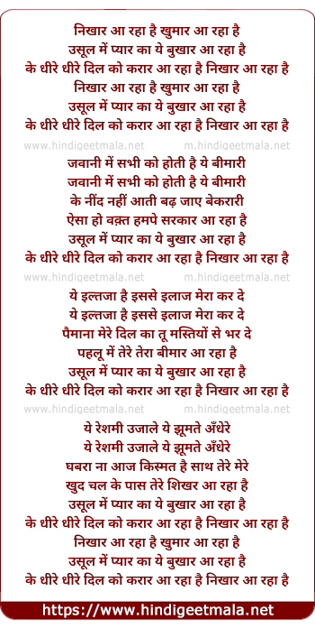 Lyrics of Nikhar Aa Raha Hai Khumar Aa Raha Hai - निखार आ रहा है खुमार आ रहा है