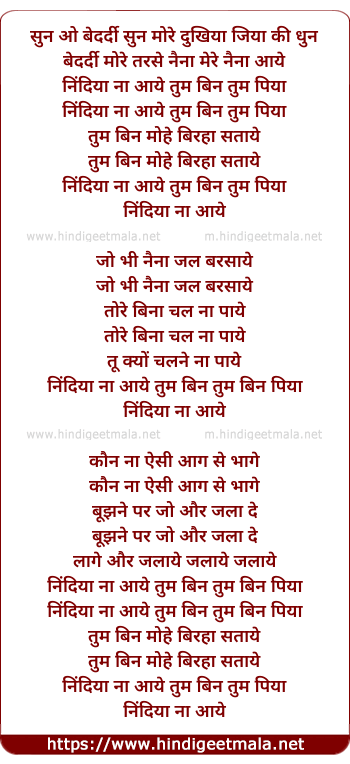 Lyrics of Nindiya Na Aaye Tum Bin Piya, Tum Bin Mohe Birha - निंदिया ना आये तुम बिन पिया, तुम बिन मोहे बिरहा
