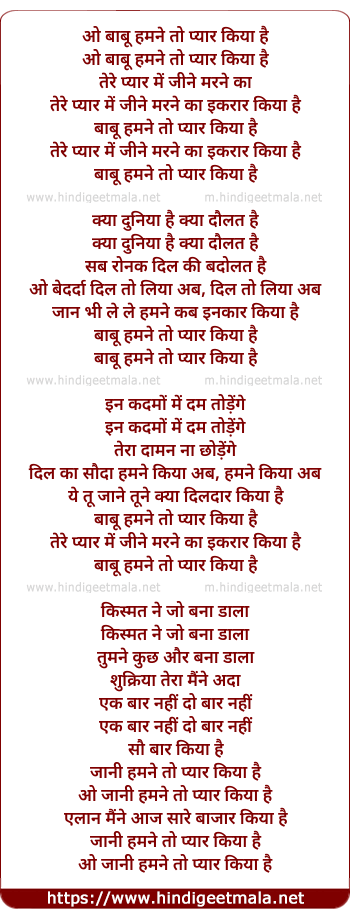 Lyrics of O Babu Humne To Pyar Kiya Hai - ओ बाबू हमने तो प्यार किया है
