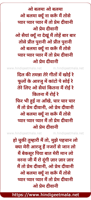 Lyrics of O Balma Kyun Na Karun Main Tose - ओ बलमा ओ बलमा