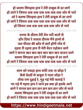 Lyrics of Ho Balma Sipahiya Haye Re Teri Banduk Se Dar Laage - हो बलमा सिपइया हाय रे तेरी बन्दुक से डर लागे