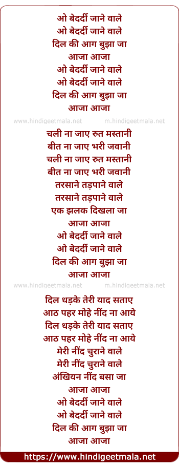 Lyrics of O Bedardi Jaane Wale - ओ बेदर्दी जाने वाले