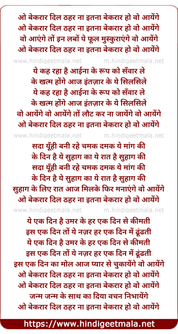 Lyrics of O Beqarar Dil Thaher Na Itna Beqarar Ho - ओ बेकरार दिल ठहर ना इतना बेकरार हो