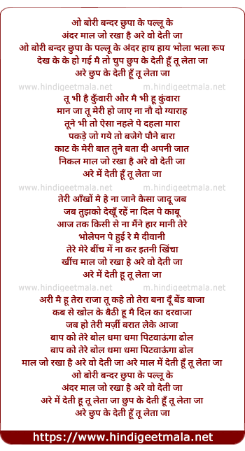 Lyrics of O Bori Bandar Chhupa Ke Palu Ke - ओ बोरी बन्दर छुपा के पल्लू के