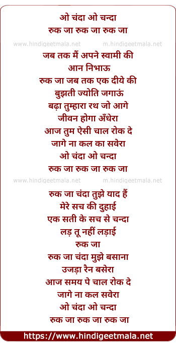 Lyrics of O Chanda O Chanda Ruk Ja Ruk Ja - ओ चंदा ओ चन्दा रुक जा रुक जा