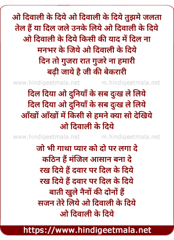 Lyrics of O Diwali Ke Diye Tujhme Jalta Tel Hai Ya Dil Jale Unke Liye - ओ दिवाली के दिये तुझमे जलता तेल हैं या दिल जले उनके लिये