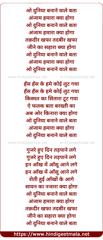 Lyrics of O Duniya Banane Wale Bata - ओ दुनिया बनाने वाले बता