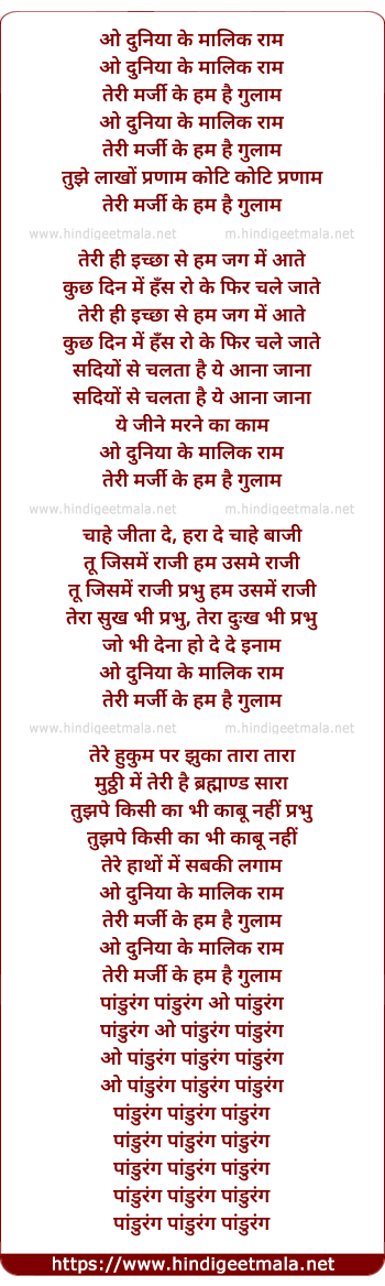 Lyrics of O Duniya Ke Malik Ram Teri Marzi - ओ दुनिया के मालिक राम तेरी मर्जी