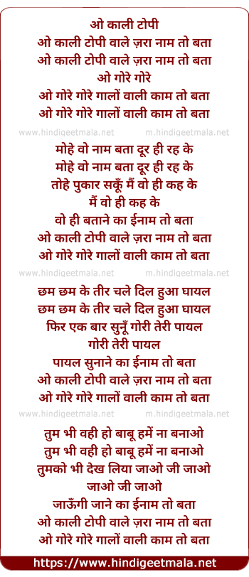 Lyrics of O Kaali Topi Vaale Zaraa Naam To Bataa - ओ काली टोपी वाले जरा नाम तो बता