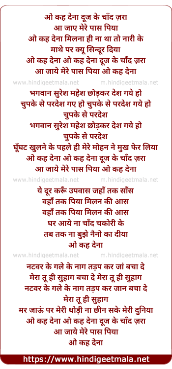 Lyrics of O Keh Dena Dooj Ke Chand - ओ कह देना दूज के चाँद