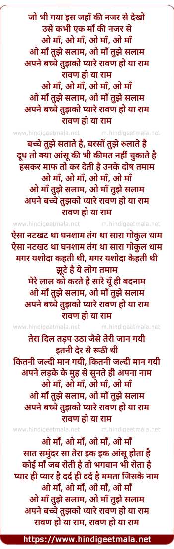 Lyrics of O Maa Tujhe Salam - ओ माँ तुझे सलाम