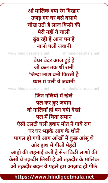 Lyrics of O Maalik Kya Rang Dikhaye - ओ मालिक क्या रंग दिखाए