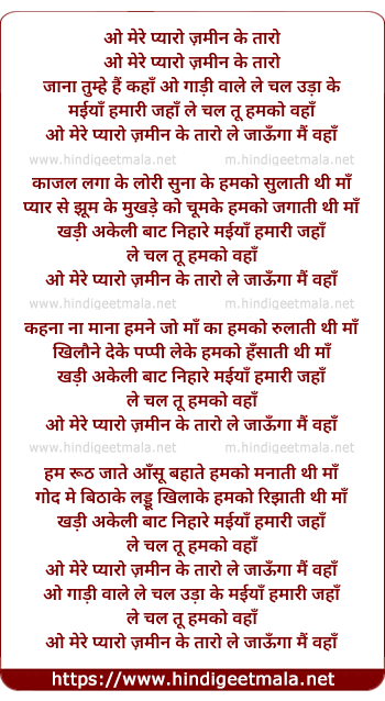 Lyrics of O Mere Pyaro Zameen Ke Taro - ओ मेरे प्यारो ज़मीन के तारो